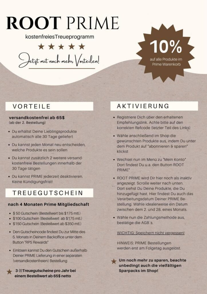 Du möchtest Root-Produkte ausprobieren. Das freut mich für dich. Ich empfehle dir das Prime, das Treueprogramm von Root. (Wenn dir das Produkt nicht gefällt kannst du das Prime sofort kündigen – siehe unübersehbarer roter Balken. Und vergibst dir nichts :-)) Warum? Weil du dabei in erster Linie mal sparst. Und zwar ab der zweiten Lieferung die Portokosten. Und zweitens – weil deine Lieferung immer rechtzeitig kommt. Als ich angefangen habe mit den Root-Produkten, gab es das Treueprogramm noch nicht – und ich habe immer wieder vergessen es rechtzeitig zu bestellen und es entstanden nervige Pausen dadurch. Wenn du Fragen hast – bitte kontaktiere mich gerne. sabine.wachsmann@well-vita.ch